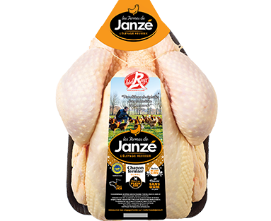 1 gros chapon fermier Label Rouge de Janzé, fini au lait frais cru, présenté nu dans un emballage alimentaire. Poids du chapon : 3300 g (+ ou – 200 g)