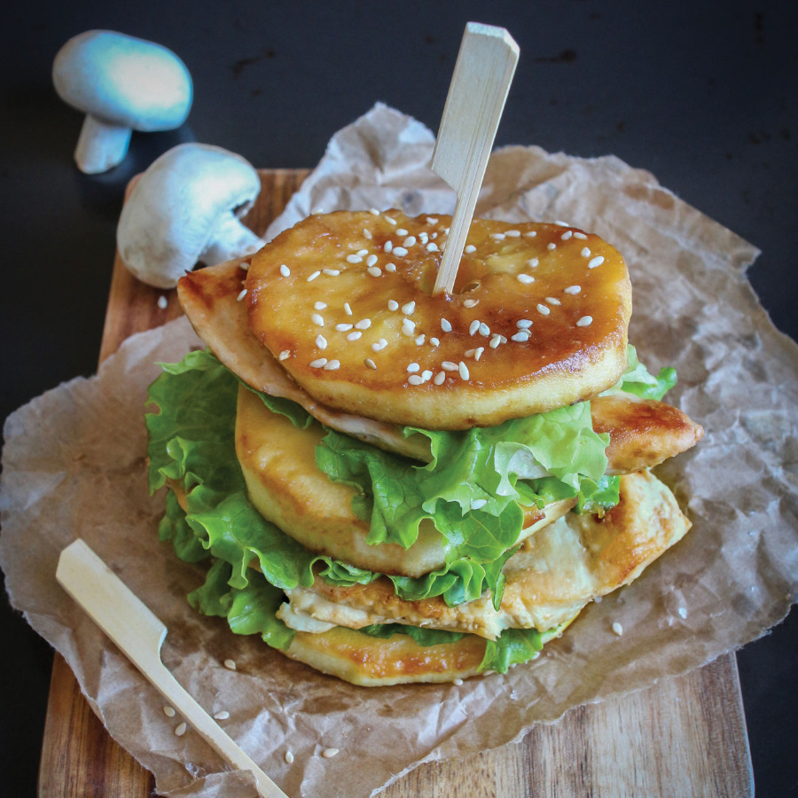 Disposez les champignons au centre de l’assiette puis montez successivement, comme pour un burger, une rondelle de pomme poêlée, une feuille de batavia, un demi-filet de poulet de Janzé, une nouvelle feuille de salade et pour terminer, une rondelle de pomme. Versez la sauce autour de ce burger puis décorez l’assiette avec quelques quartiers de tomates cerise.